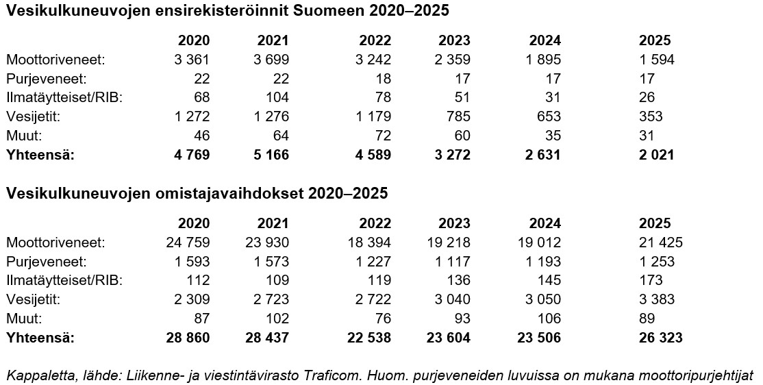 Vuonna 2025 erilaisia uusia vesikulkuneuvoja rekisteröitiin 2 021 kappaletta (2 631 kappaletta vuonna 2024), joten laskua oli edelliseen vuoteen verrattuna 23 prosenttia. Moottoriveneitä rekisteröitiin 1 594 kappaletta (1 895 kappaletta) ja kovapohjaisia ilmatäytteisiä veneitä eli RIB:ejä 26 (31) kappaletta. Vesijettejä rekisteröitiin 353 kappaletta (653). Uusien veneiden ensirekisteröinteihin lasketaan kuluvana ja kahtena edellisenä vuonna valmistetut veneet.