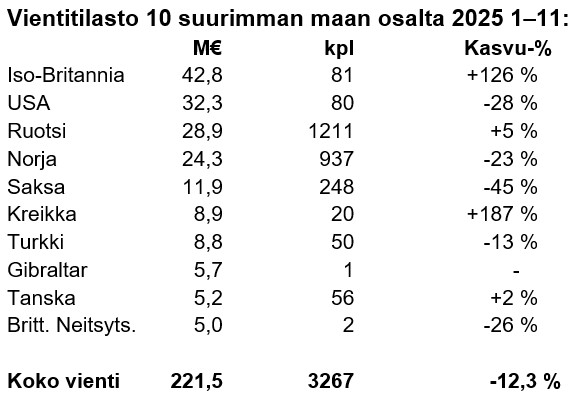 Tullitilaston mukaan Suomen veneviennin arvo laski tammi-marraskuussa 2025 noin 12 % verrattuna edelliseen vuoteen. Veneitä vietiin yli 3 267 kappaletta 49 eri maahan. Lukumääräisesti venevienti kuitenkin kasvoi 9 %.